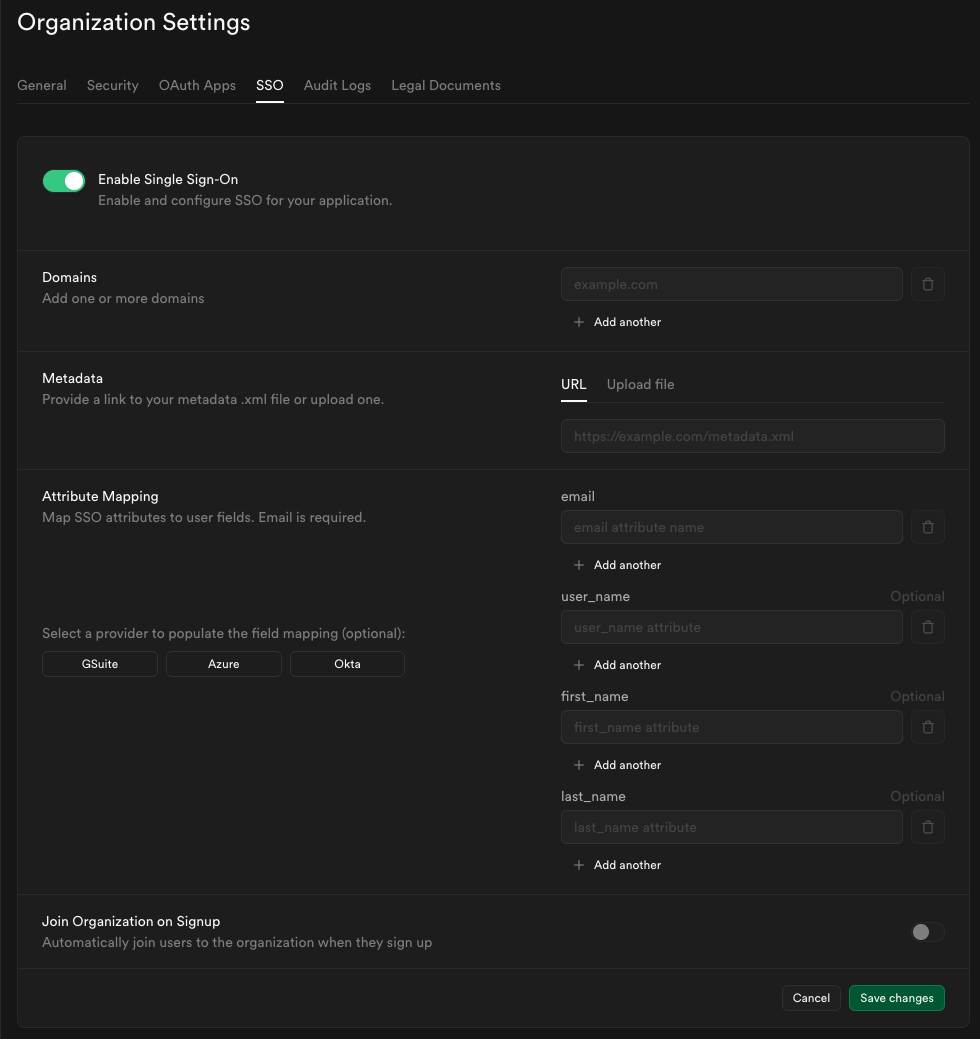 Once configured, you can update your settings anytime via the SSO tab under Organization Settings.