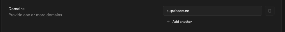 If your organization uses more than one email domain - for example, supabase.com for staff and supabase.io for contractors - you can add multiple domains here. All listed domains will be authorized for SSO sign-in.